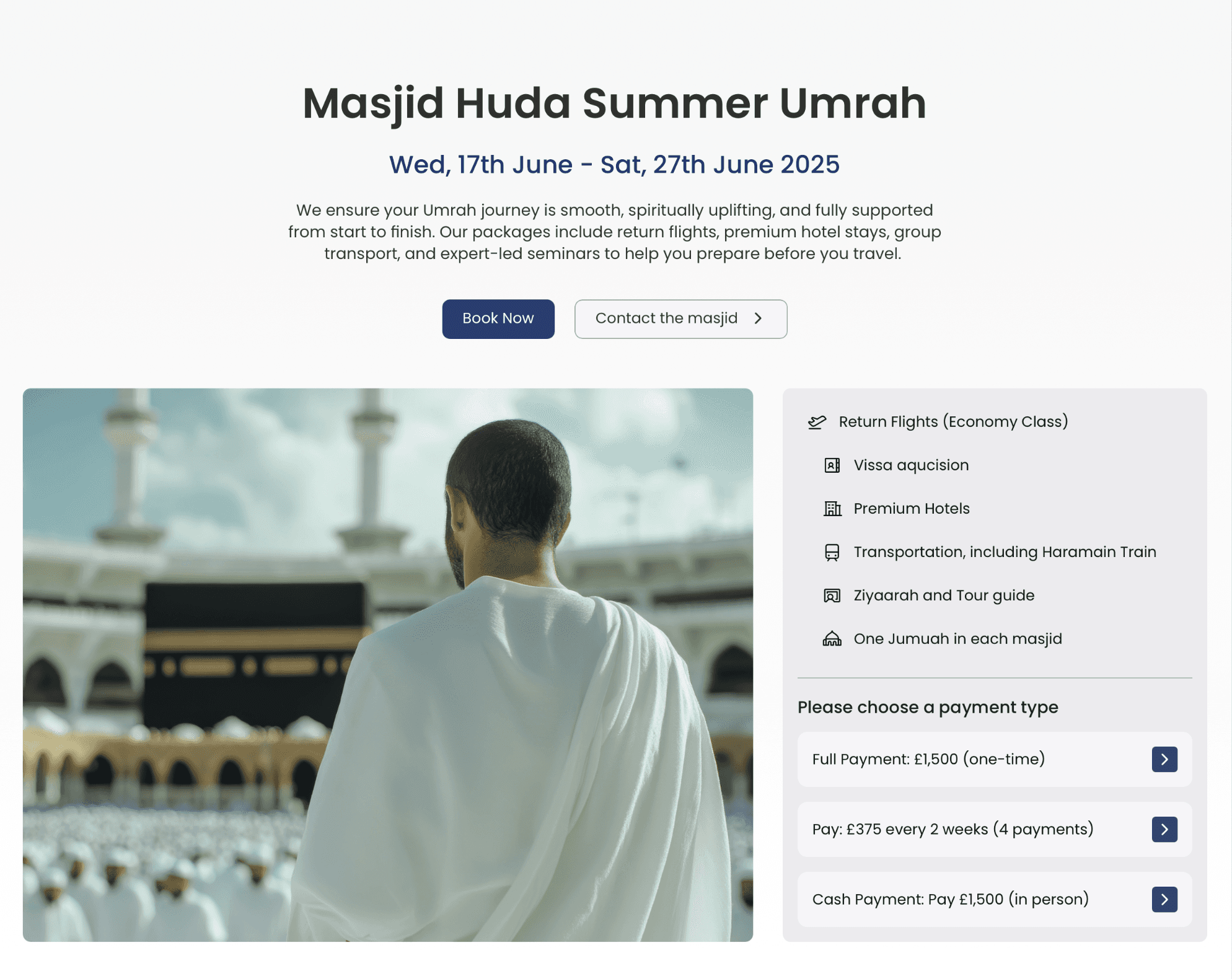 We’ll create and maintain a custom page for your organisation under our domain. It will display your name, your Umrah details, and serve as the booking hub for your travellers.